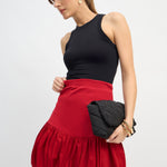 Red Rib Balloon Hem Mini Skirt, in Rib fabric, Poly Knit Lining, Above Knee, Comfort Fit, NA, Straight Hemline and features Self Design