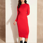 Women Red Rib Bodycon Full Sleeves Midi Dress