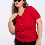Red Rib Front Button Lace Detail Top , in Rib fabric, Unlined, Regular Length , Comfort Fit , Button Closure, Straight Hemline and features Metal Button Detail At Front