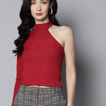 Red Rib One Shoulder Collar Crop Top, in Lycra Rib fabric, Unlined, Crop Length, Slim Fit, No Closure, Straight Hemline and features One Shoulder detail