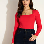 Women Red Rib Square Neck Full Sleeves Top