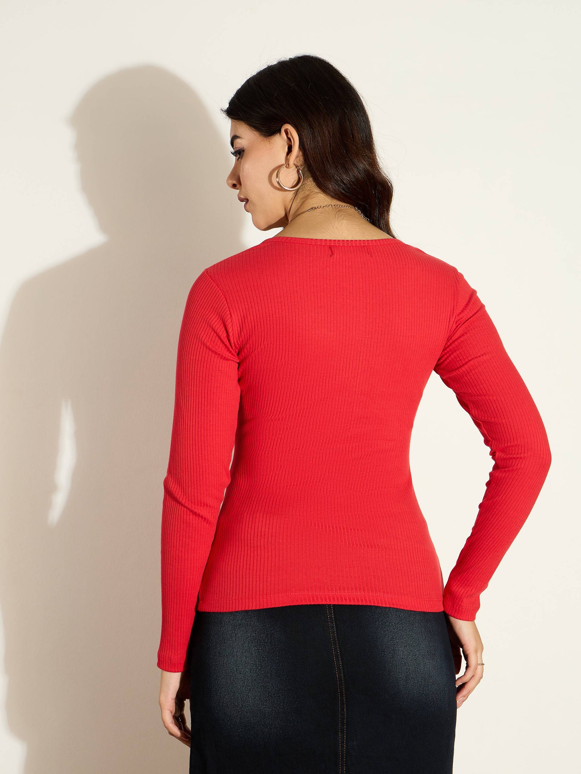 Red Rib Square Neck Full Sleeves Top, in Rib fabric, Unlined, Regular Length, Slim Fit, No Closure, Straight Hemline and features Self Ribbed Design