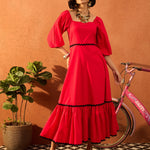 Red Ric Rac Lace Square Neck Maxi Dress, in Cotton Poplin fabric, Unlined, Maxi Length, Comfort Fit, No Closure, Flared Hemline and features Ric Rac Lace Detail