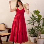 Women Red Schiffli Strappy Tiered Maxi Dress