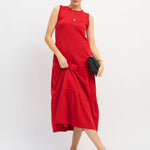 Red Sleeveless Tiered Midi Dress, in Jersey fabric, Unlined, Below Knee, Fit & Flare, NA, Flared Hemline and features Rib At Neck & Sleeve