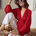 Red V-Neck Peplum Top, in Georgette fabric, Polyknit, Regular Length, Fit & Flare, No Closure, Flared Hemline and features Waist Cut Out Detail