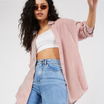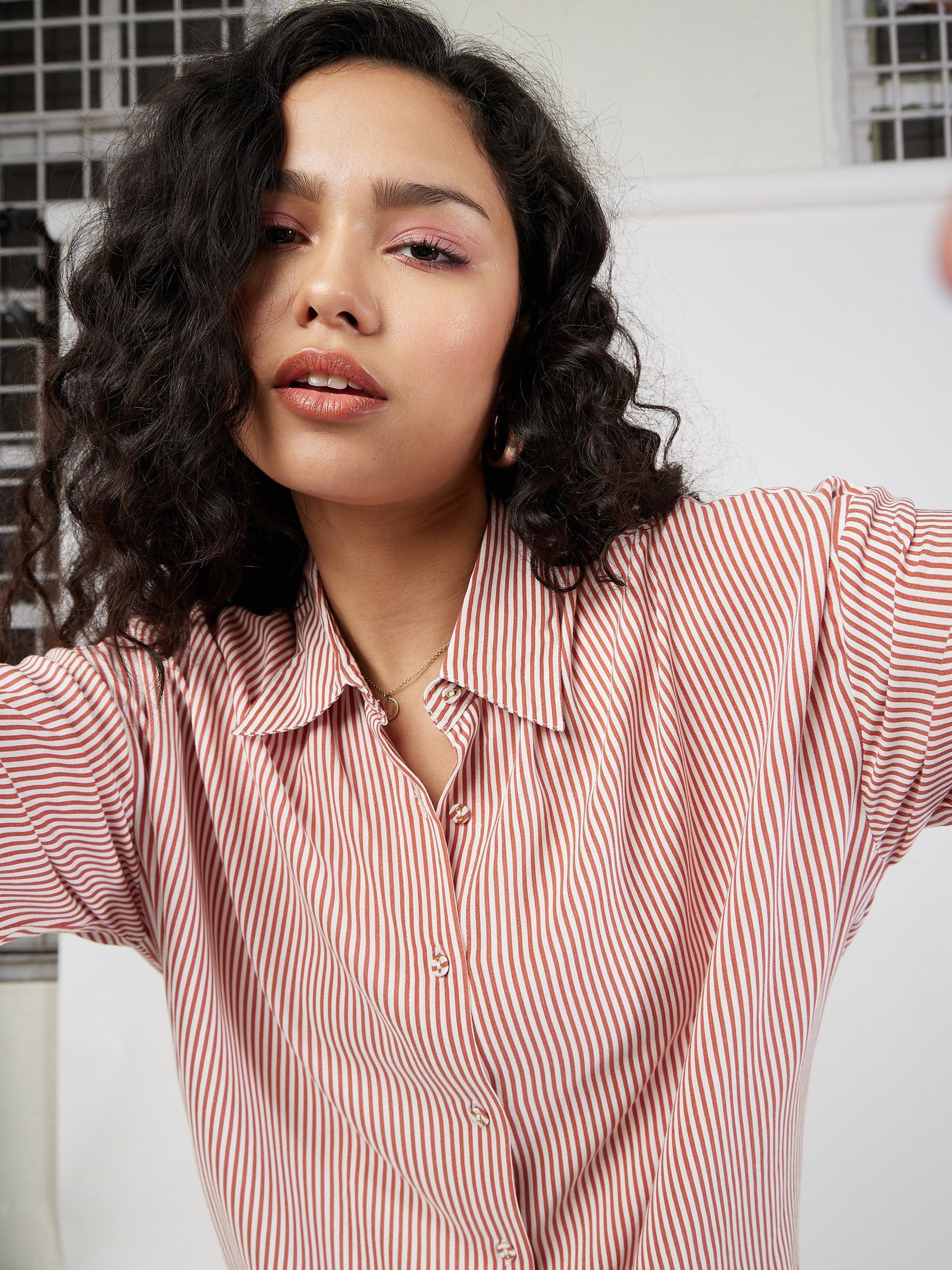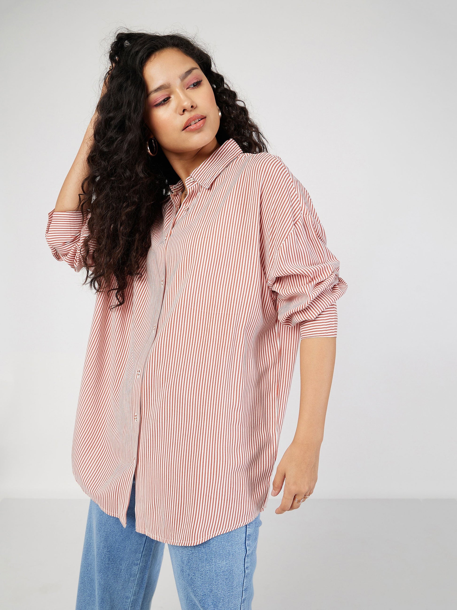 Red & White Pinstriped Oversize Shirt, in Rayon fabric, Unlined, Regular Length, Loose Fit, Button Closure, Curved Hemline and features Elastic Detail At Back Waist