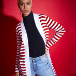 Women Red & White Striped Front Open Sweater