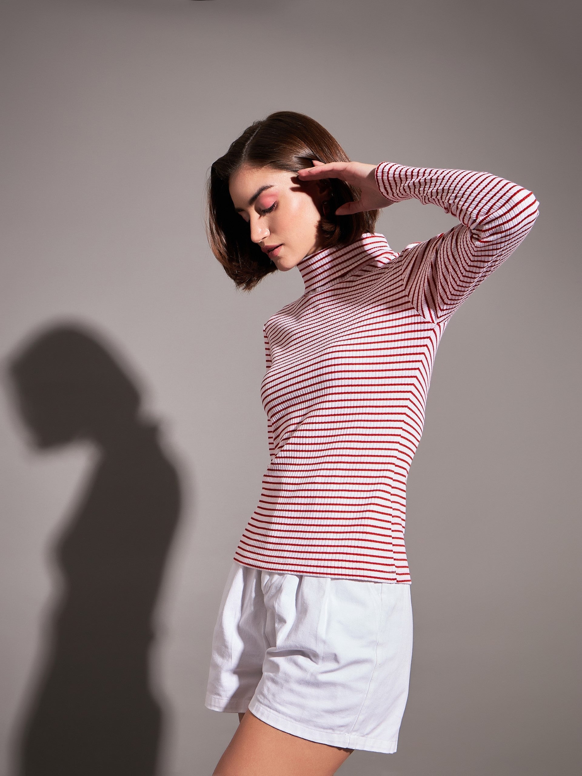 Red & White Striped Rib High Neck Top, in Rib fabric, Unlined, Regular Length, Slim Fit, No Closure, Straight Hemline and features Self Rib Design