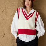 Red & White Striped V-Neck Sweater Vest, in Acrylic fabric, Unlined, Short Length, Comfort Fit, No Closure, Straight Hemline and features Contrast Color Detail At Neck & Hem