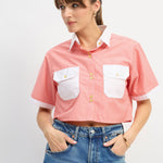 Red & White Stripes Crop Shirt, in Cotton Poplin fabric, Unlined, Crop Length, Regular Fit, Button Closure, Straight Hemline and features Contrast Patch Pocket At Front