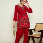 Red Woollen Embroidered Sweetheart Short Kurta With Farshi Salwar, in Wool Acrylic fabric, Unlined, Short Length , Comfort Fit, No Closure , Straight Hemline and features Embroidery Detail At Neck
