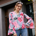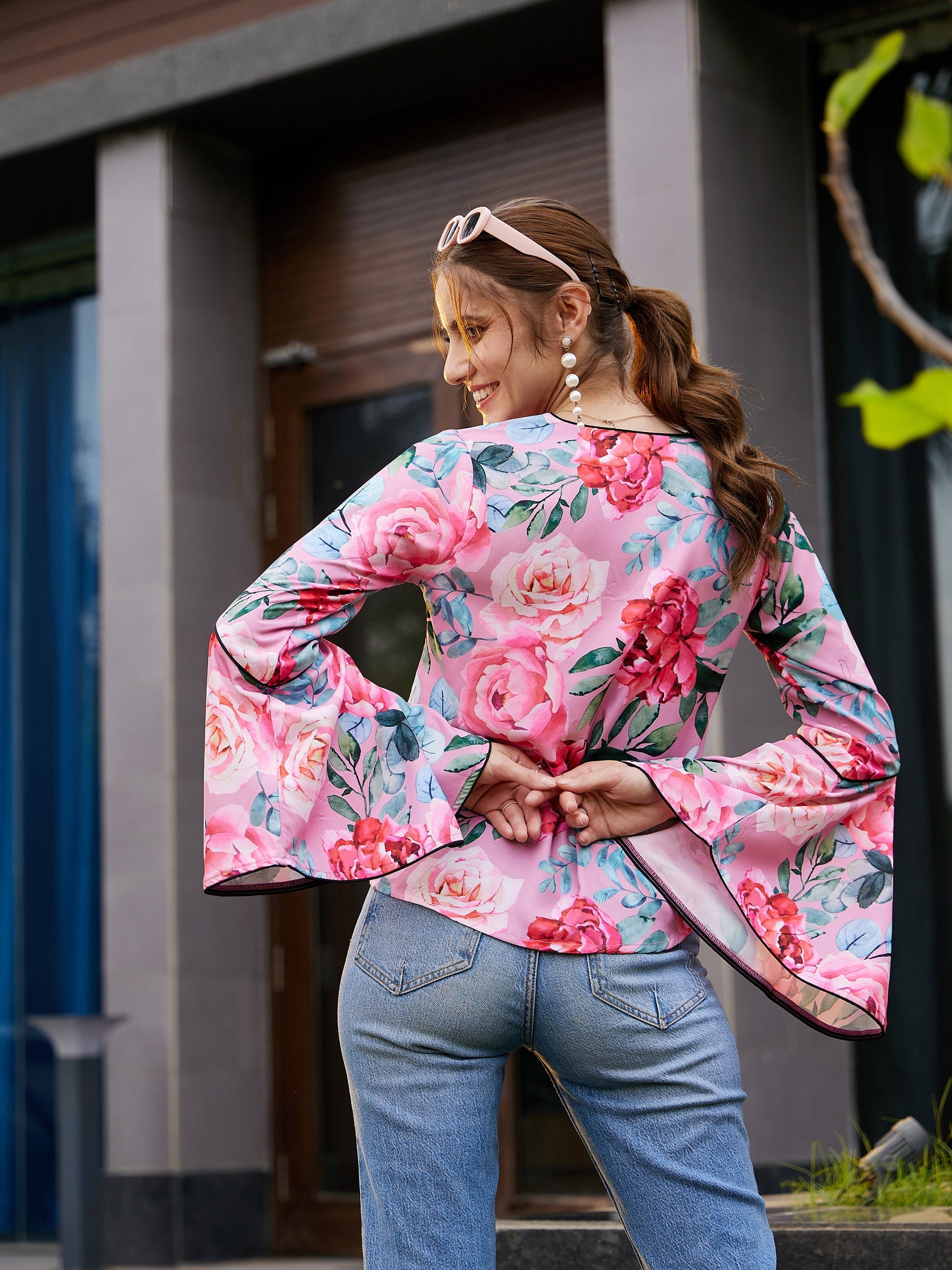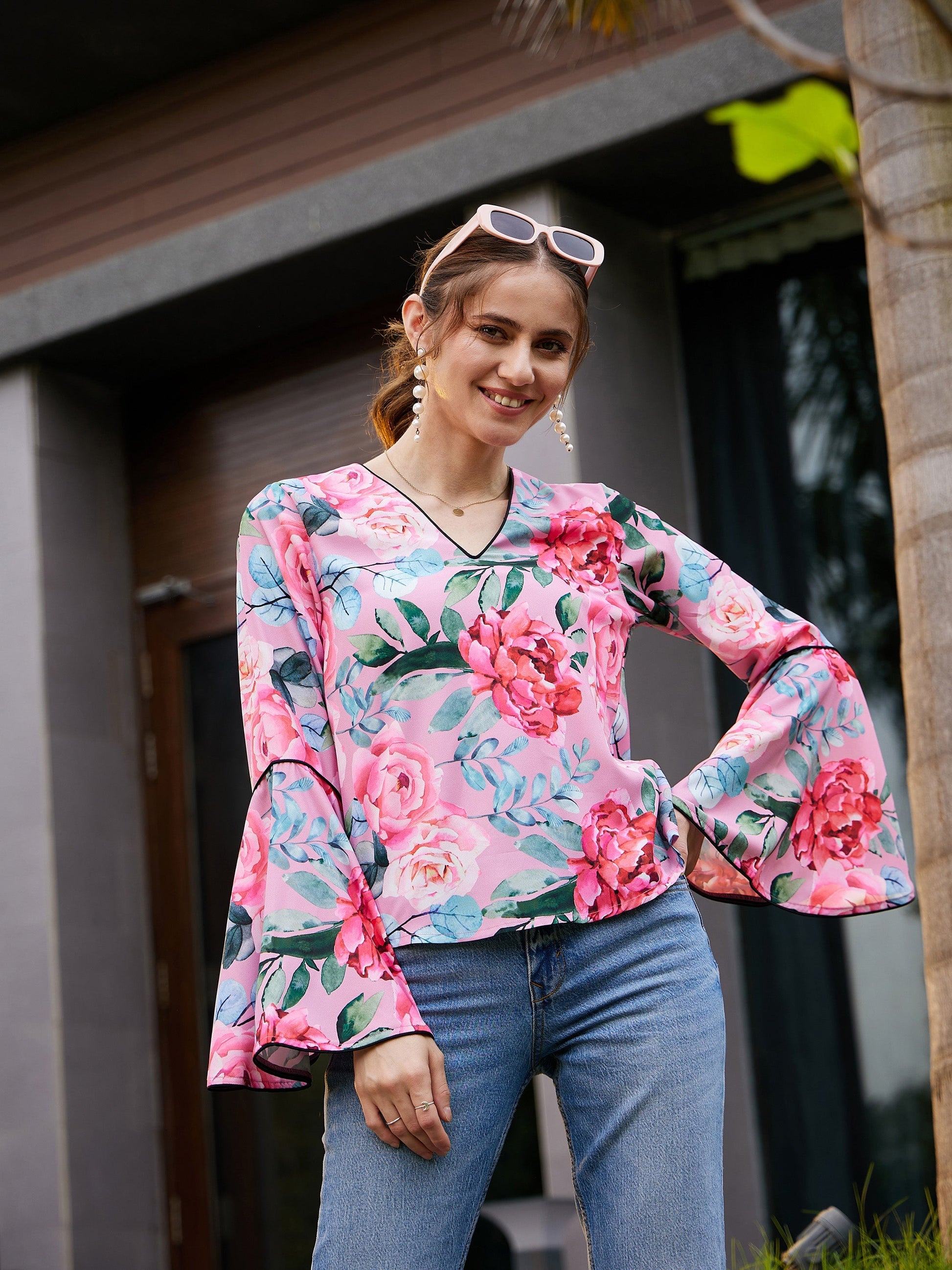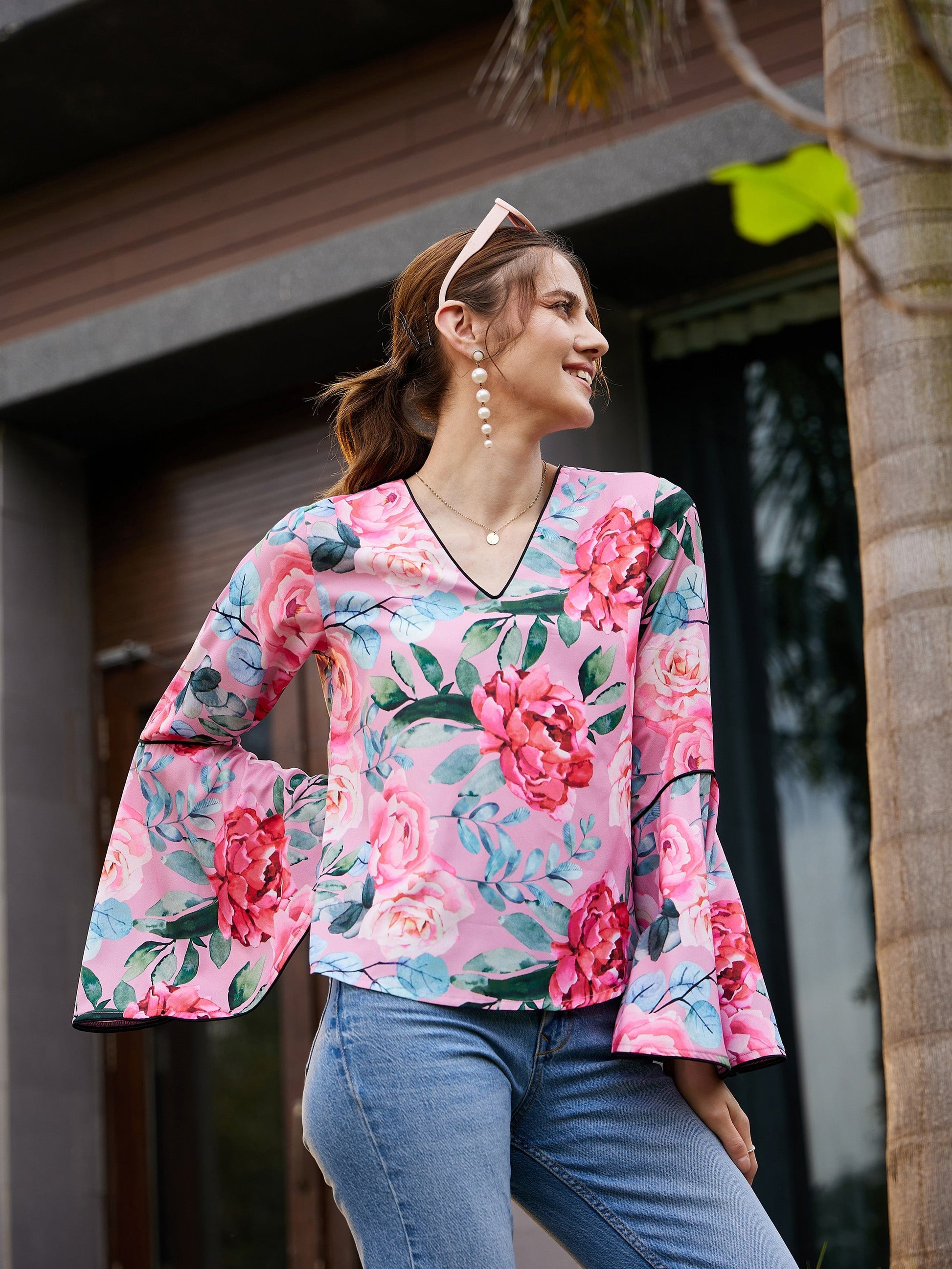 Rose Floral Bell Sleeves Regular Top, in Summer Cool fabric, Unlined, Regular Length, Comfort Fit, NA, Straight Hemline and features Contrast Piping Detail At Neck & Sleeves