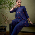 Royal Blue All Over Embroidered Shirt With Palazzos, in Rayon fabric, Unlined, Regular Length, Comfort Fit, Button Closure, Straight Hemline and features All Over Embroidered Detail