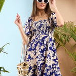 Royal Blue Floral Smoked Mini Dress, in Poly Moss fabric, Polyester, Above Knee, Fit & Flare, No Closure, Flared Hemline and features Cut Out At Back