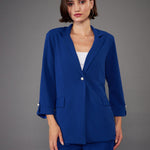 Royal Blue Front Button Blazer, in Karera Knit fabric, Polycrepe, Regular Length, Regular Fit, Button Closure, Straight Hemline and features Fancy Button Detail