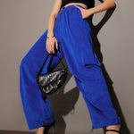 Women Royal Blue Pleated Knee Corduroy Cargo Pants