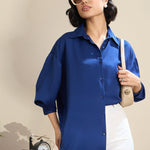 Women Royal Blue Satin Oversized Curved Hem Shirt