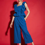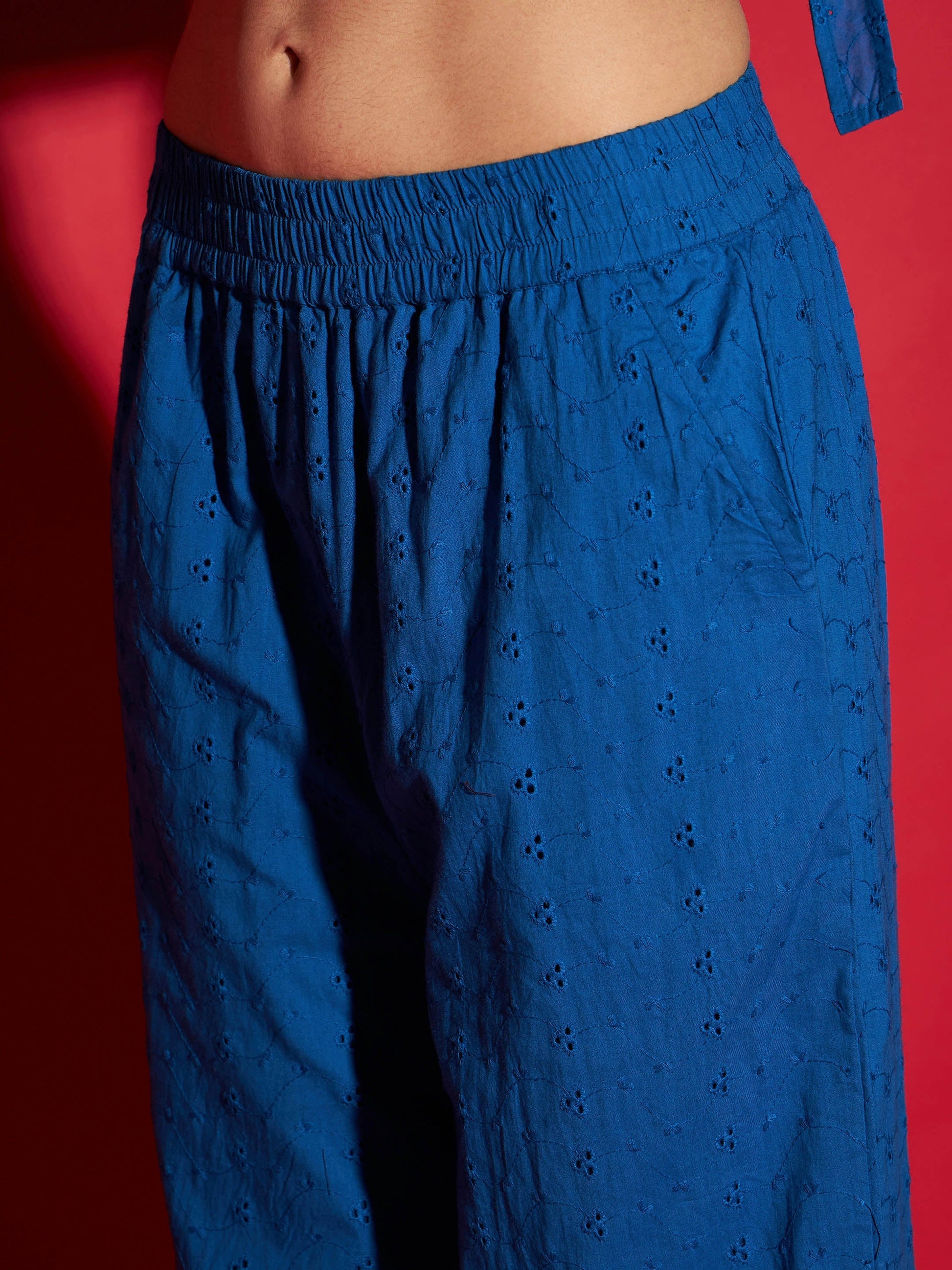 Royal Blue Schiffli Peplum Top With Palazzos, in Cotton Schiffli fabric, Cotton Voile, Regular Length, Regular Fit, No Closure, Flared Hemline and features Back tie Detail/Elasticated Waistband