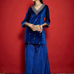 Women Royal Blue Velvet Emb V-Neck Short Kurta With Palazzos