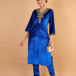 Women Royal Blue Velvet Embroidered Straight Kurta With Pencil Pants