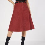 Rust Corduroy A-Line Midi Skirt, in Corduroy fabric, Unlined, Below Knee, A-Line, Button Closure, Flared Hemline and features Elastic Detail At Waist