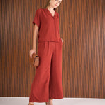 Rust Notch Collar Top With Straight Pants, in TL Polyester fabric, Unlined, Regular Length, Regular Fit, Button Closure, Straight Hemline and features Patch Pocket At Front / Bone Pocket Detail At Back