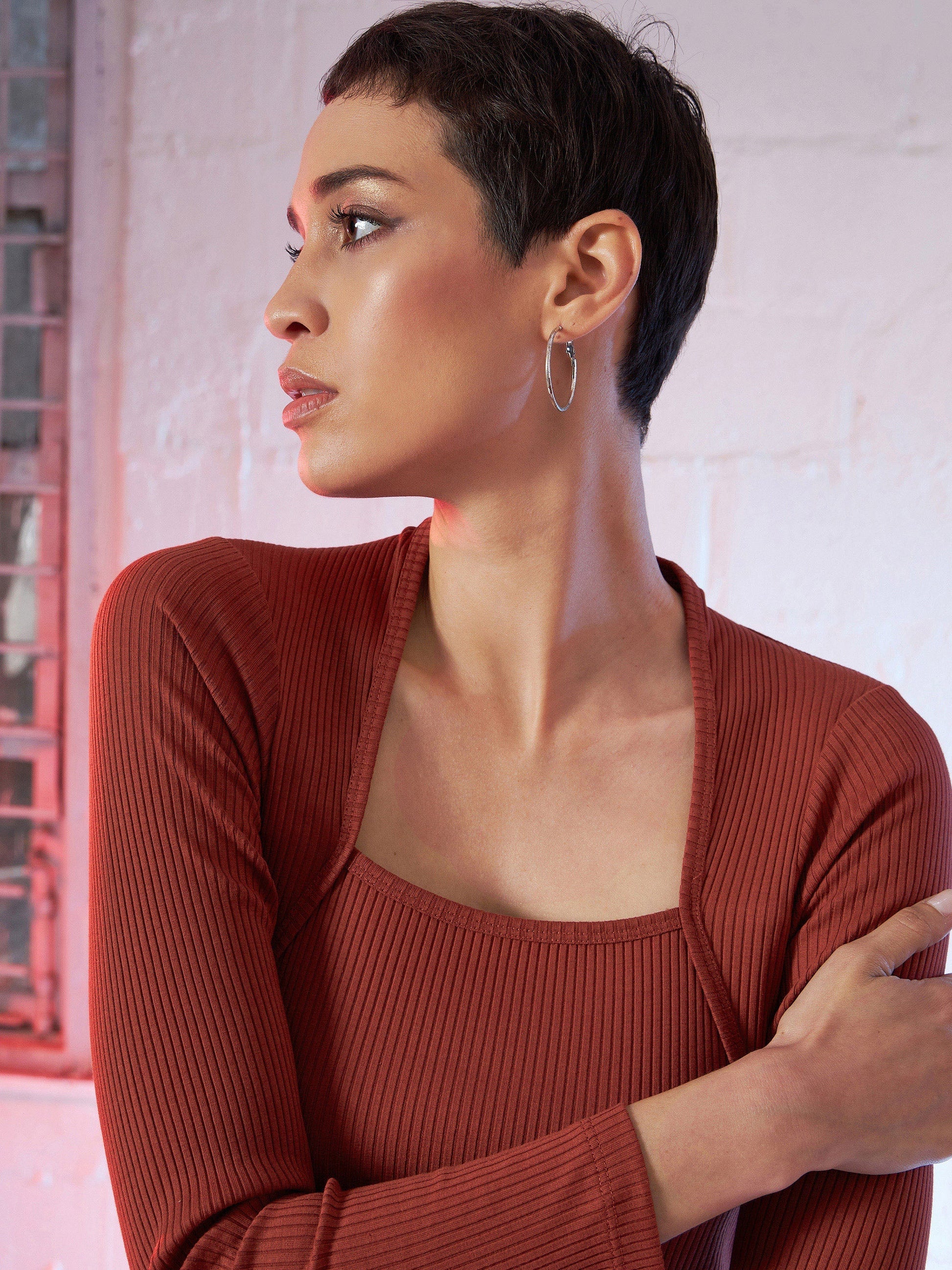 Rust Rib Side Slit Full Sleeves Bodycon Dress, in Rib fabric, Unlined, Midi Length, Slim Fit, No Closure, Straight Hemline and features Slit At Side