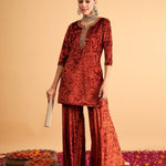 Women Rust Velvet Embroidered Short Kurta With Palazzos