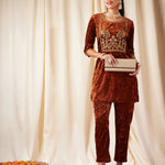 Women Rust Velvet Embroidered Yoke Short Kurta With Pants