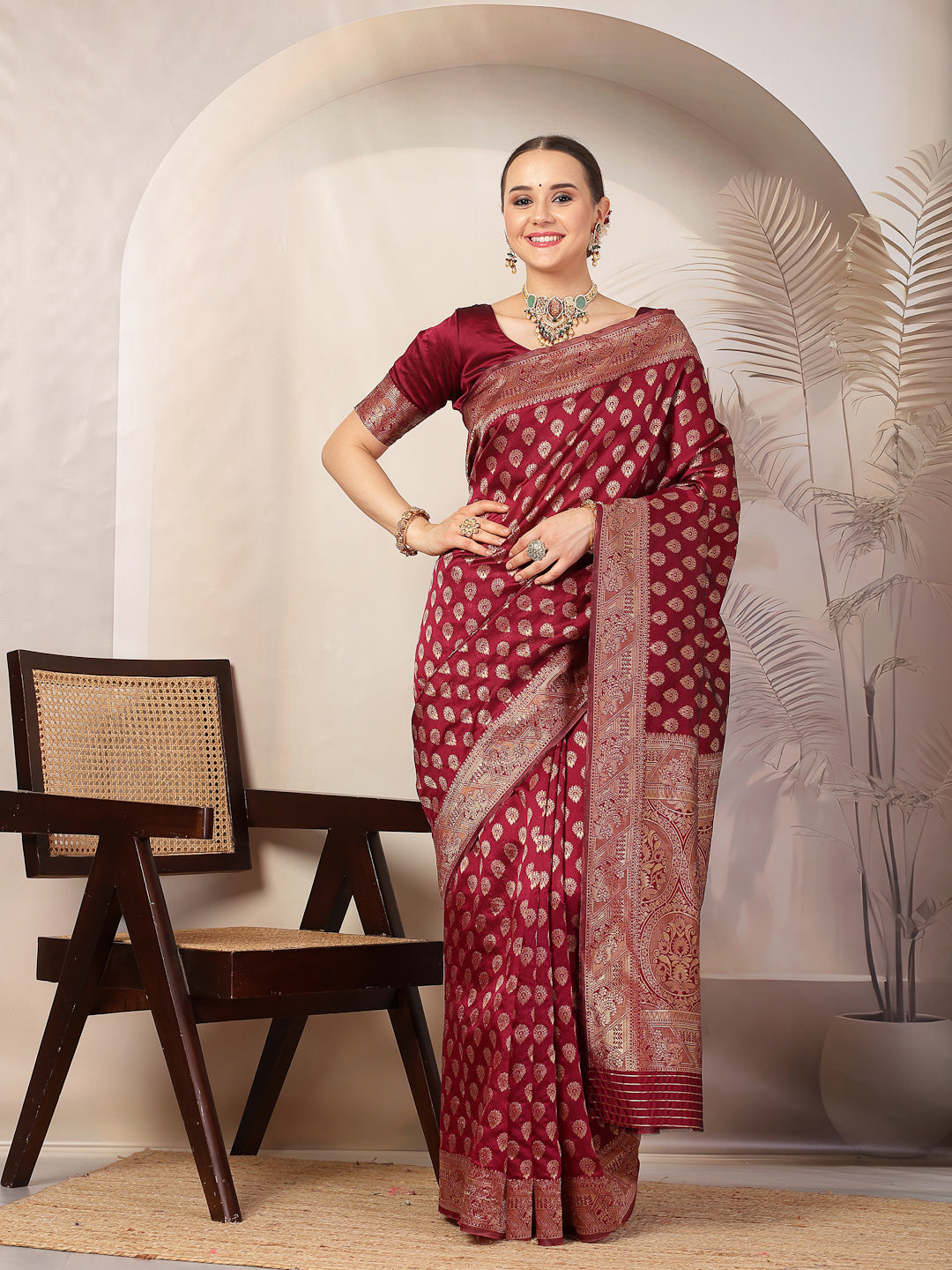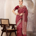 Wine Ethnic Motifs Banarsi Woven Zari Silk Saree