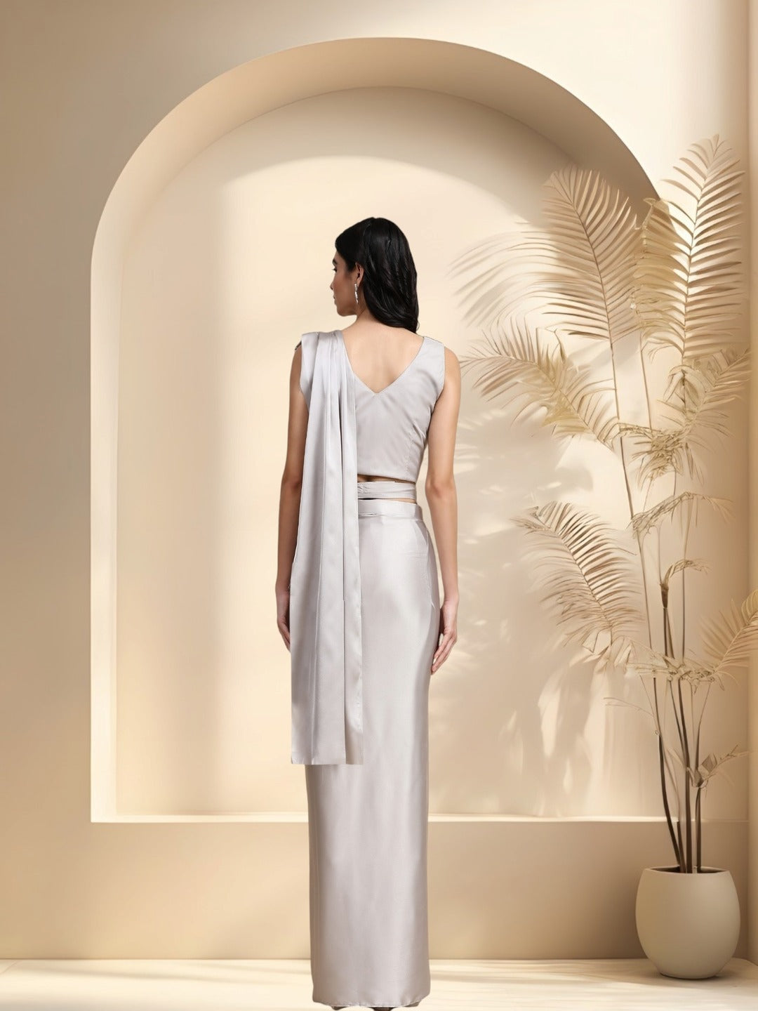 Grey Party Wear Belted Ready To Wear Satin Saree