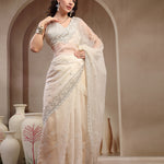 White Solid & Embroidered Organza Saree With Unstitched Blouse