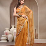 Gold Solid Shimmer Net Saree With Unstitched Blouse Piece