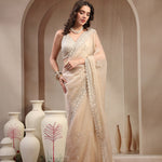 Cream Solid & Embroidered Organza Saree With Unstitched Blouse (Pre-Order)
