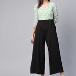 Sea Green Polka Dot Sleeve Rouching Jumpsuit, in Weightless Georgette fabric, Polyester Lining, Full Length, Comfort Fit, Zipper Closure, Flared Hemline and features Rouching Detail At Sleeves