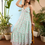 See Green Floral Strappy Tiered Maxi Dress, in Georgette fabric, Polyester, Full Length, Fit & Flare, No Closure, Flared Hemline and features Smocking Detail At Back