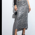Silver Sequin Pencil Skirt, in Sequience fabric, Polyknit, Below Knee, Comfort Fit, No Closure, Straight Hemline and features Elastic At Waist