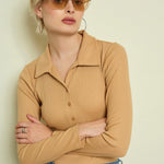 Tan Rib Polo Neck Full Sleeves Top, in Rib fabric, Unlined, Regular Length, Slim Fit, Button Closure, Straight Hemline and features Button At Front