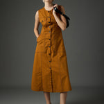 Tan Twill Waist Cut-Out Midi Dress, in Cotton Twill fabric, Unlined , Midi Length, A-Line , Button Closure , Flared Hemline and features Contrast Stitch Detail