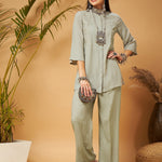 Embrace sophistication with our Taupe Embroidered Top With Palazzos. Made from Rayon fabric, this ensemble offers a comfortable fit, button closure, and flared hemline. The Zari Embroidery at the front creates a captivating and stylish look.