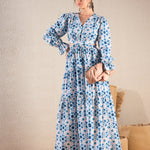 Women Teal Blue Geometric Print Waist Cut Out Maxi Dress