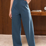 Teal Blue Pleated Flared Pants, in Canton Knit fabric, Unlined, Full Length, Regular Fit, Button Closure, Straight Hemline and features Pleat Detail