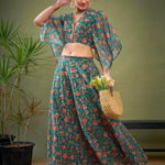 Teal Green Floral Anarkali Skirt With Crop Blouse, in Georgette fabric, Butter Crepe Lining, Crop Length, Comfort Fit/ Fit & Flare, Hook & Eye, Flared Hemline and features Drawstring Detail At Front