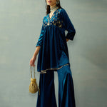 Women Teal Velvet Embroidered Peplum Top With Palazzos