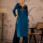 Women Teal Velvet Full Sleeves Embroidered Straight Kurta