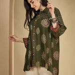 Rayon Hip Length Printed 3/4 Sleeve Shirt Collar Flared Top