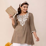 Rayon Hip Length Solid Straight 3/4 Sleeves Round Neck Solid Embroidered Top