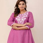 Rayon Hip Length Solid Straight 3/4 Sleeves Round Neck Solid Embroidered Top