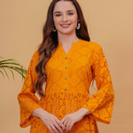 Mustard Solid Tops & Tunic - Cotton Fabric, 3/4 Sleeves, Keyhole Neck And Hips Length